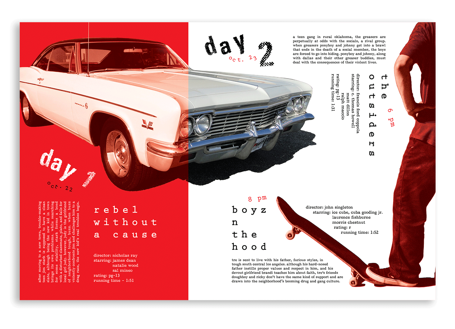 Rebels in Film is a film festival that highlights youthful protagonists struggling with growing up and in some cases, disenfranchisement and violence. The visual design is inspired by hand-set text and collages often seen in the punk scene on flyers, albums and zines. The red color theme alludes to the themes in the movie.